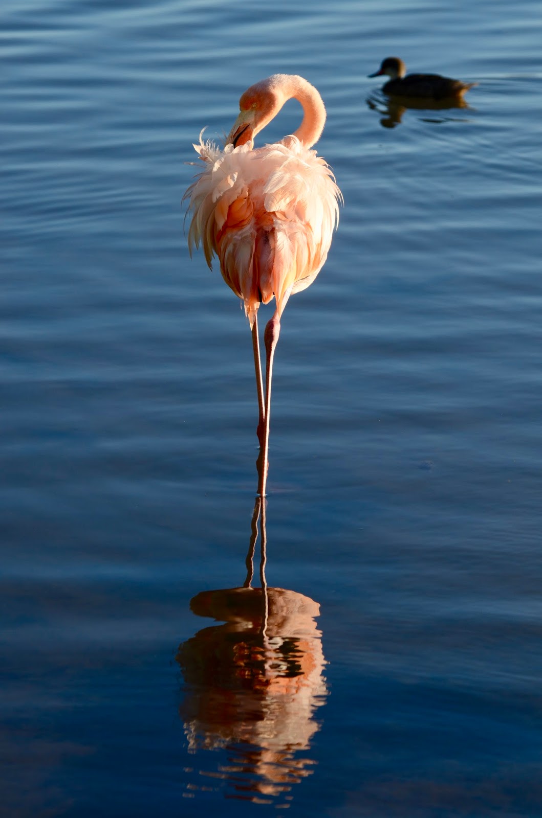 At Punta Cormorant, a walk brought us to a water lagoon where we found many flamingos. Some of them took off letting us see a beautiful black and pink pattern on their wings. The sun was setting at the time we started back to our ship.